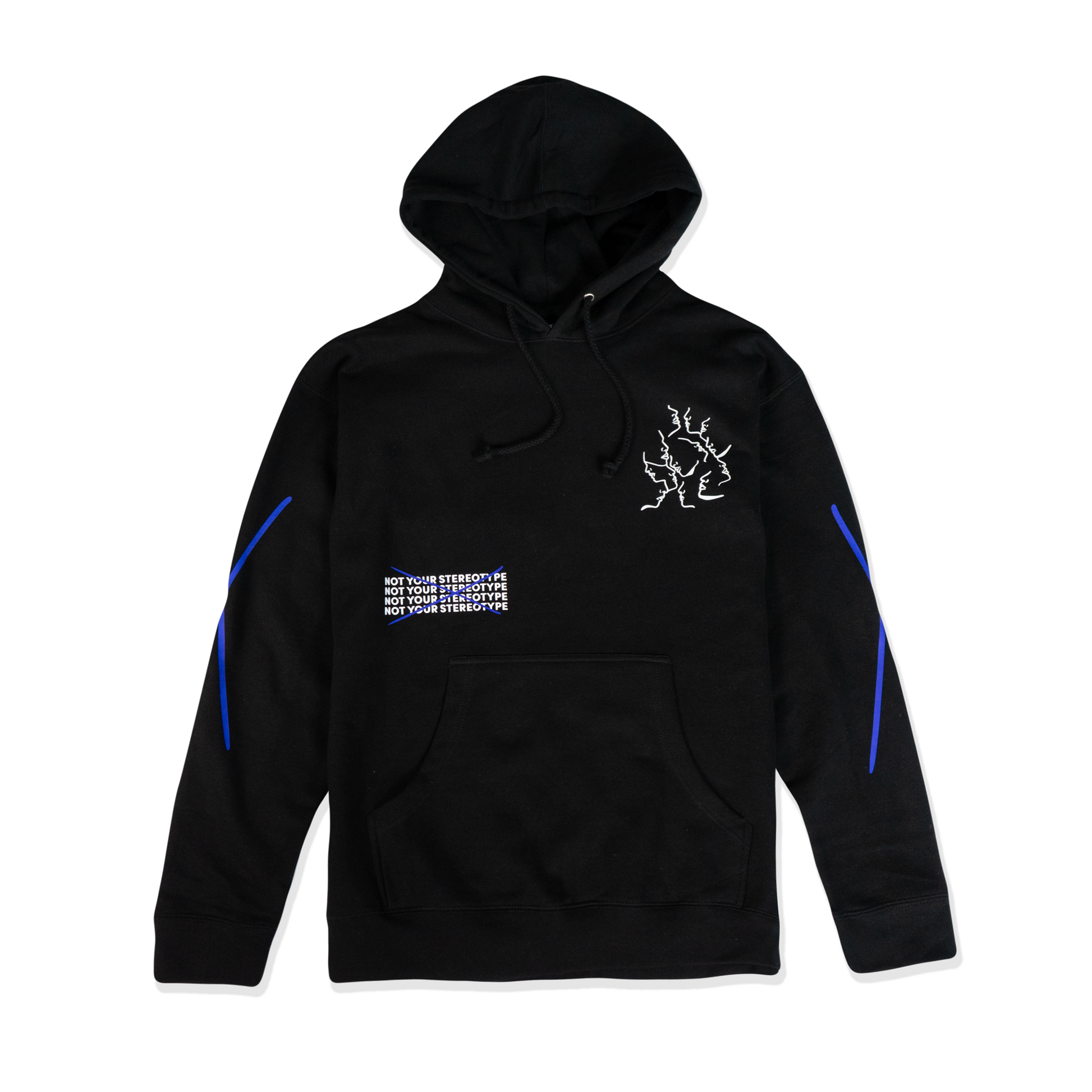 This 12oz black hoodie features a graphic line-art design consisting of multiple faces on the pocket, a blue X on each sleeve, and the words “NOT YOUR STEREOTYPE” in a crossed-out 4-row block of text. The graphic line-art is also implemented on the back as a large print, with the brand name on the bottom right of the graphic.